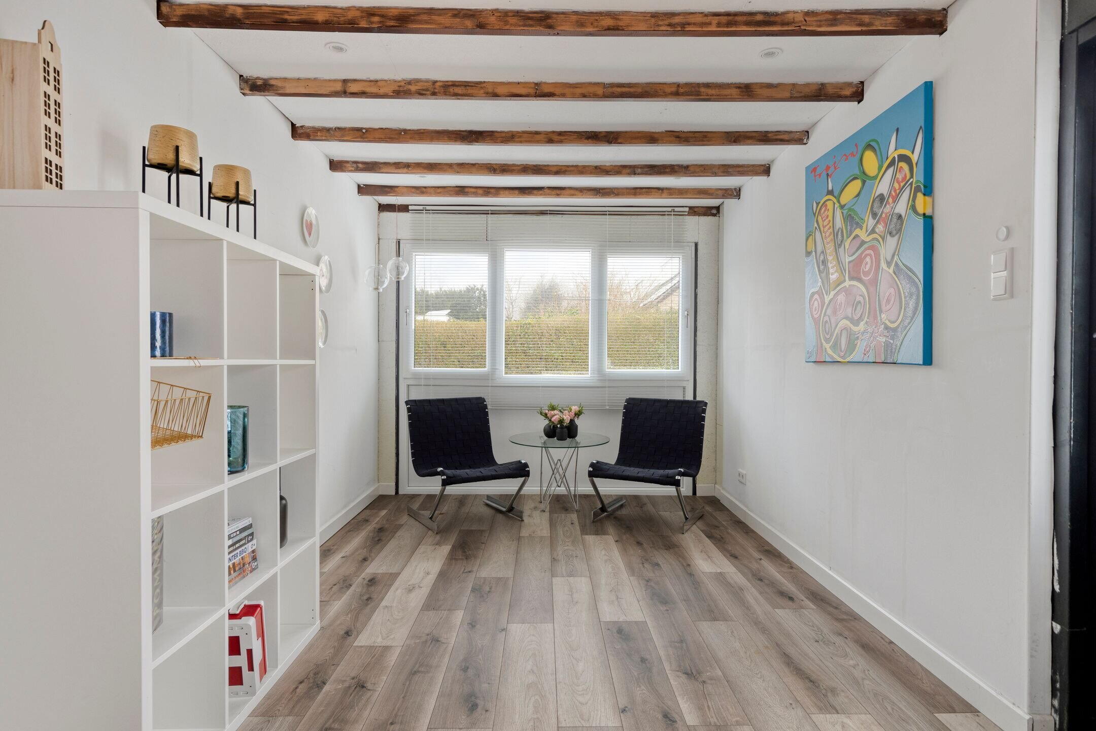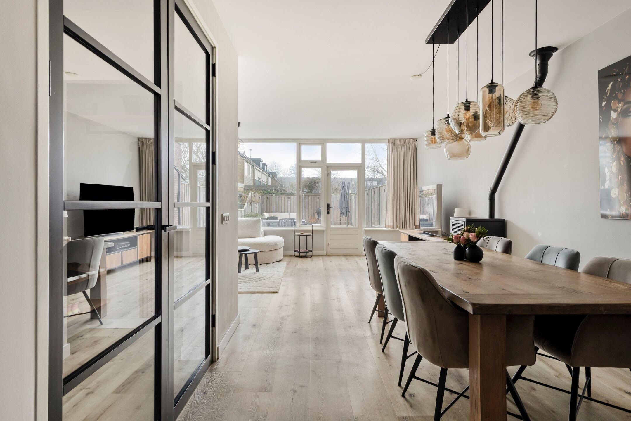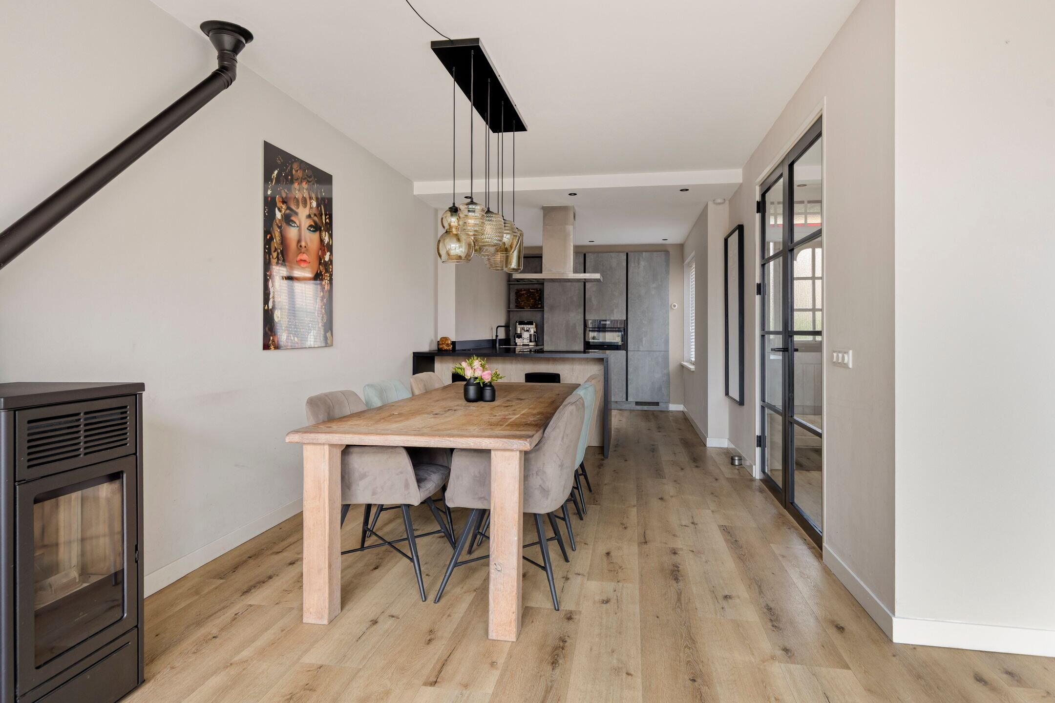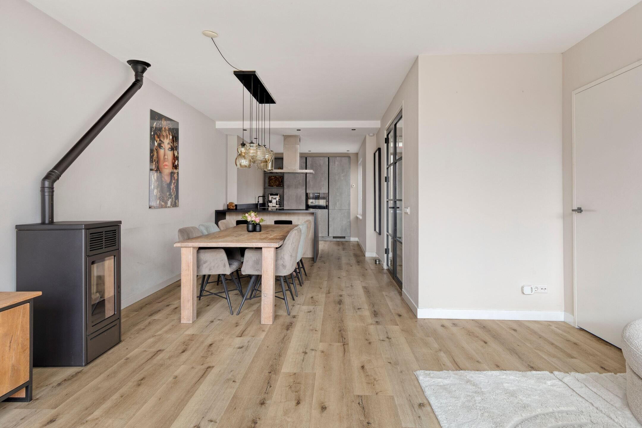 Bij binnenkomst valt direct de fijne sfeer en verzorgde afwerking op. De ruime en lichte woonkamer profiteert van grote raampartijen en een aangename hoeveelheid daglicht. De aanwezige pelletkachel zorgt niet alleen voor extra warmte, maar ook voor een gezellige en sfeervolle uitstraling.