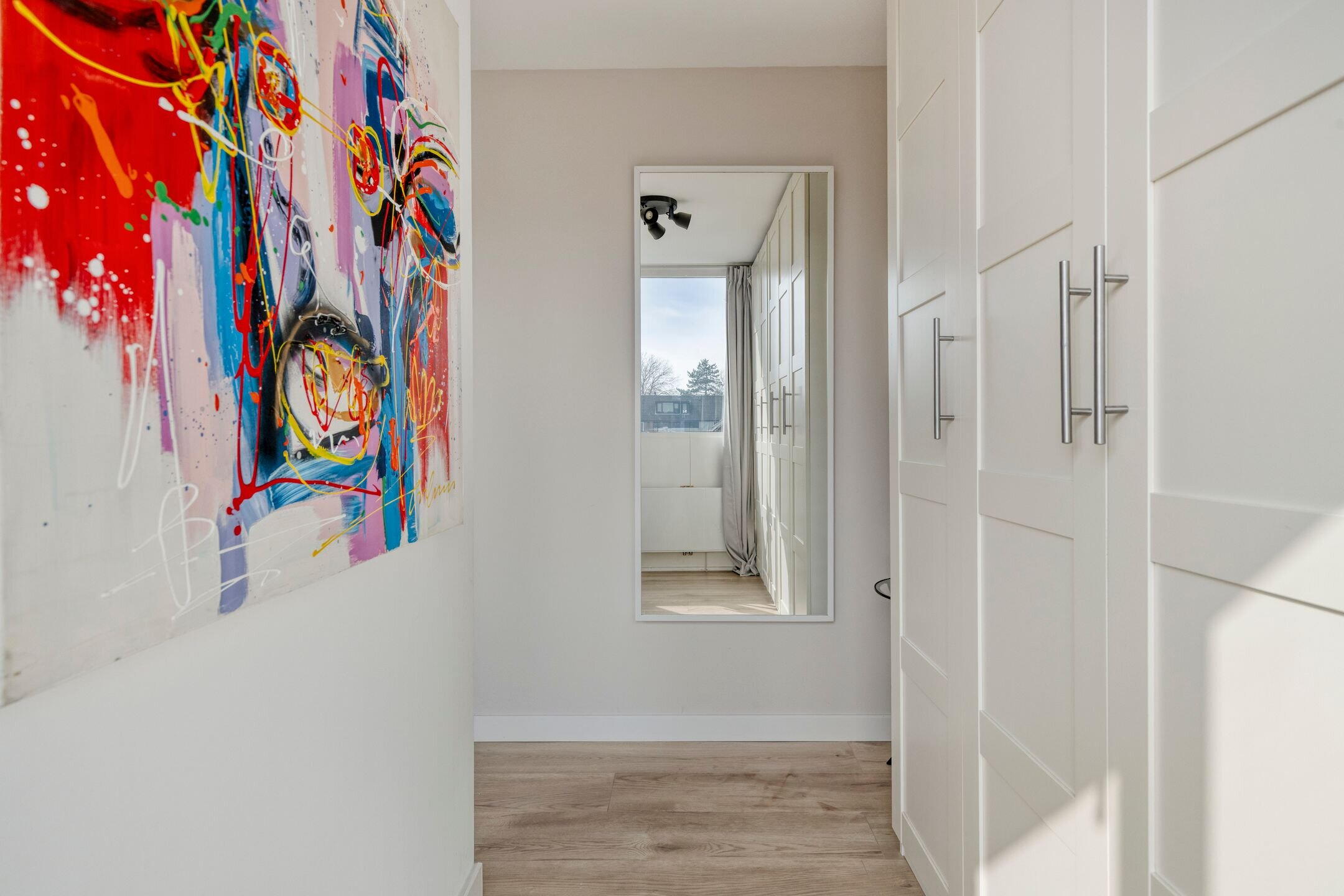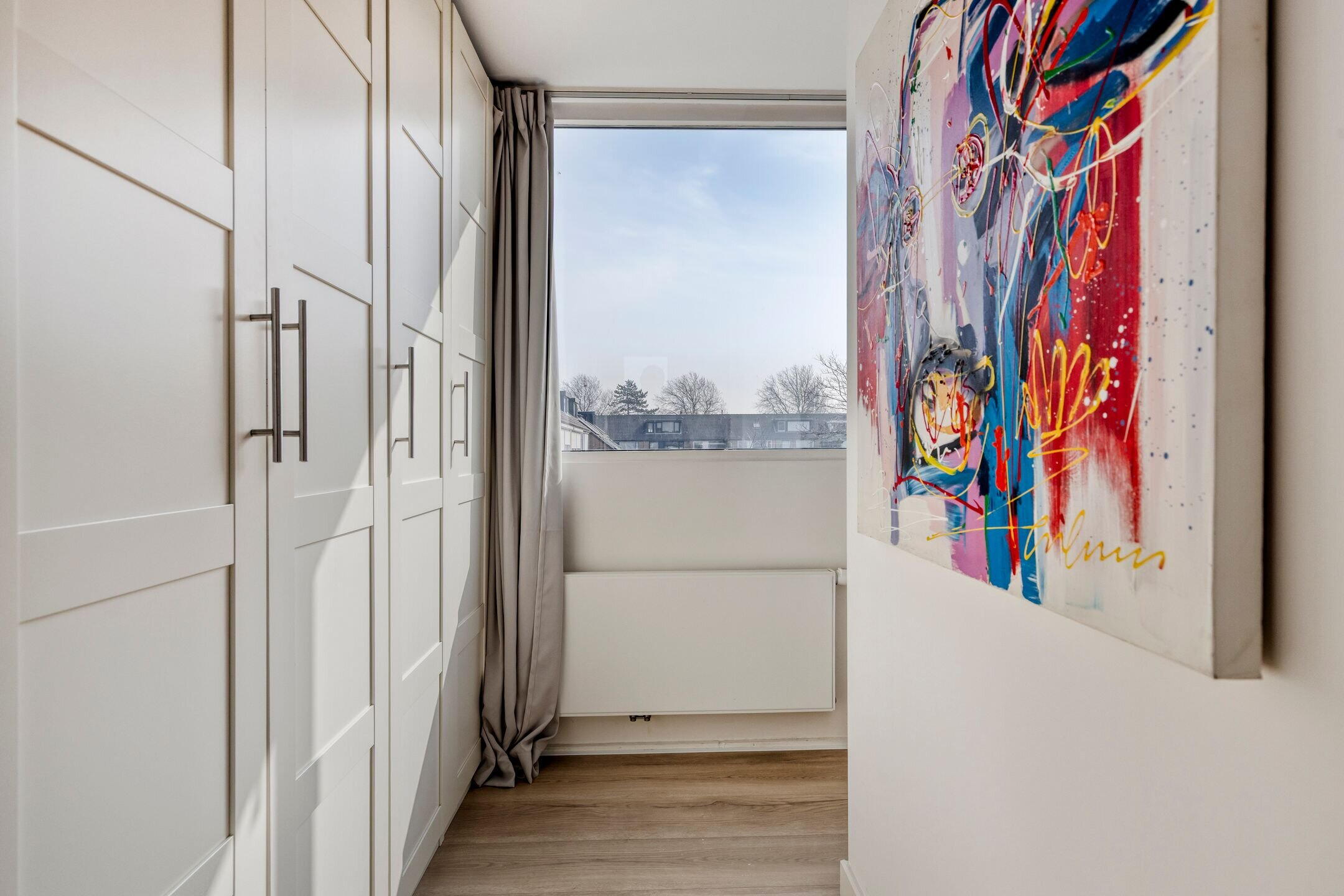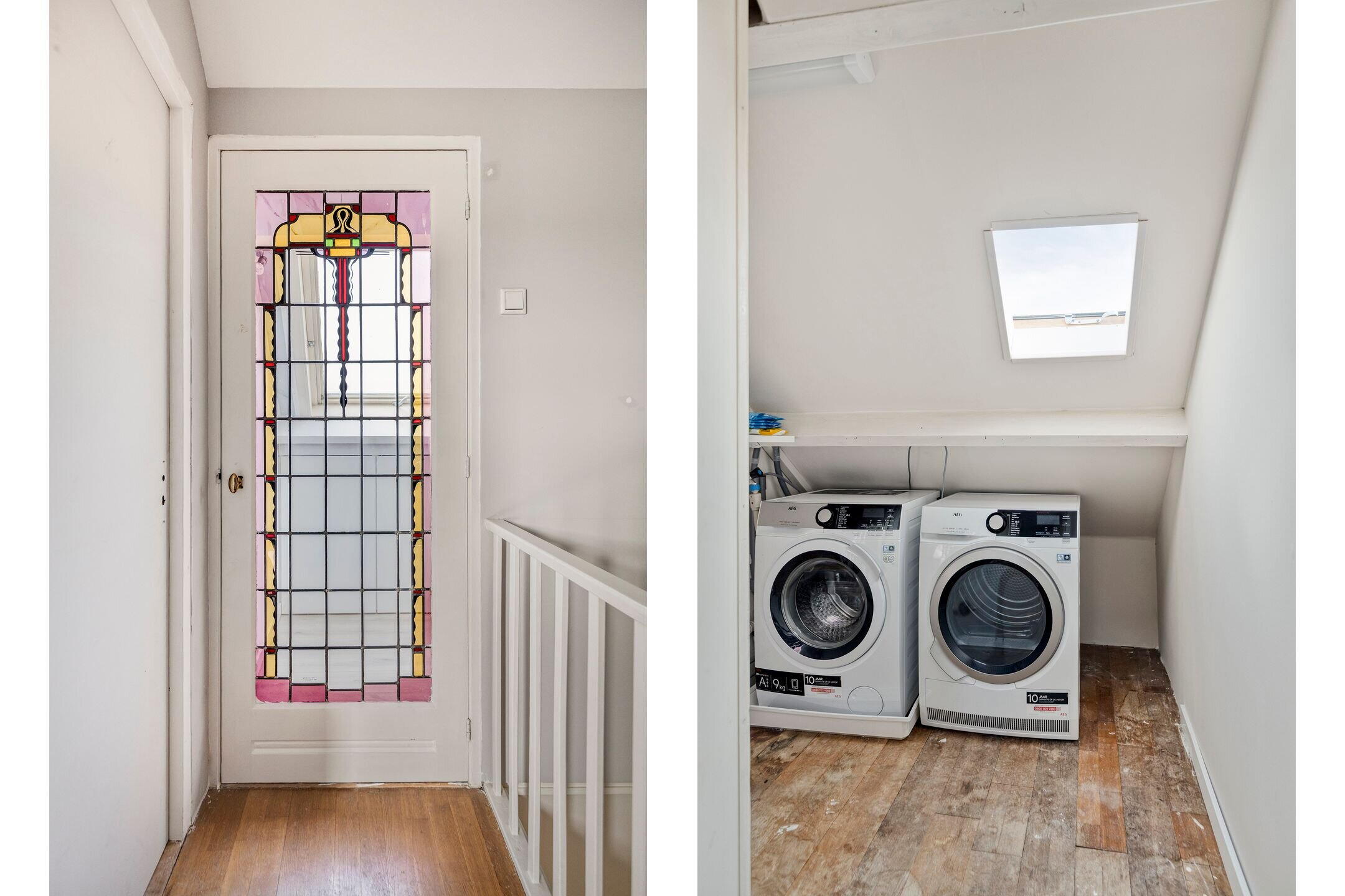 Daarnaast is er een praktische ruimte voor de wasmachine en cv-installatie, uit het zicht weggewerkt. Op deze verdieping bevindt zich bovendien een tweede, compacte badkamer met wastafel, wat deze verdieping extra comfortabel en praktisch maakt.