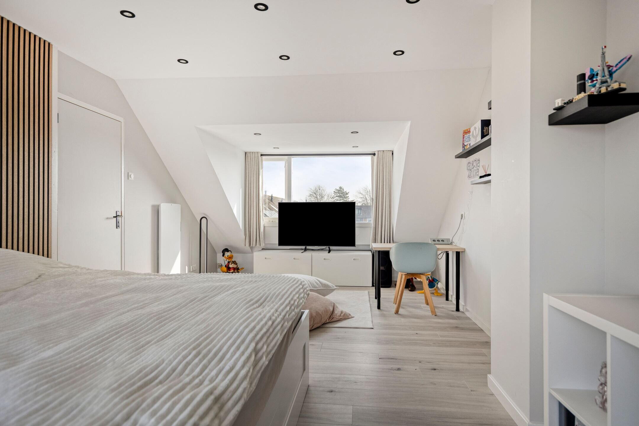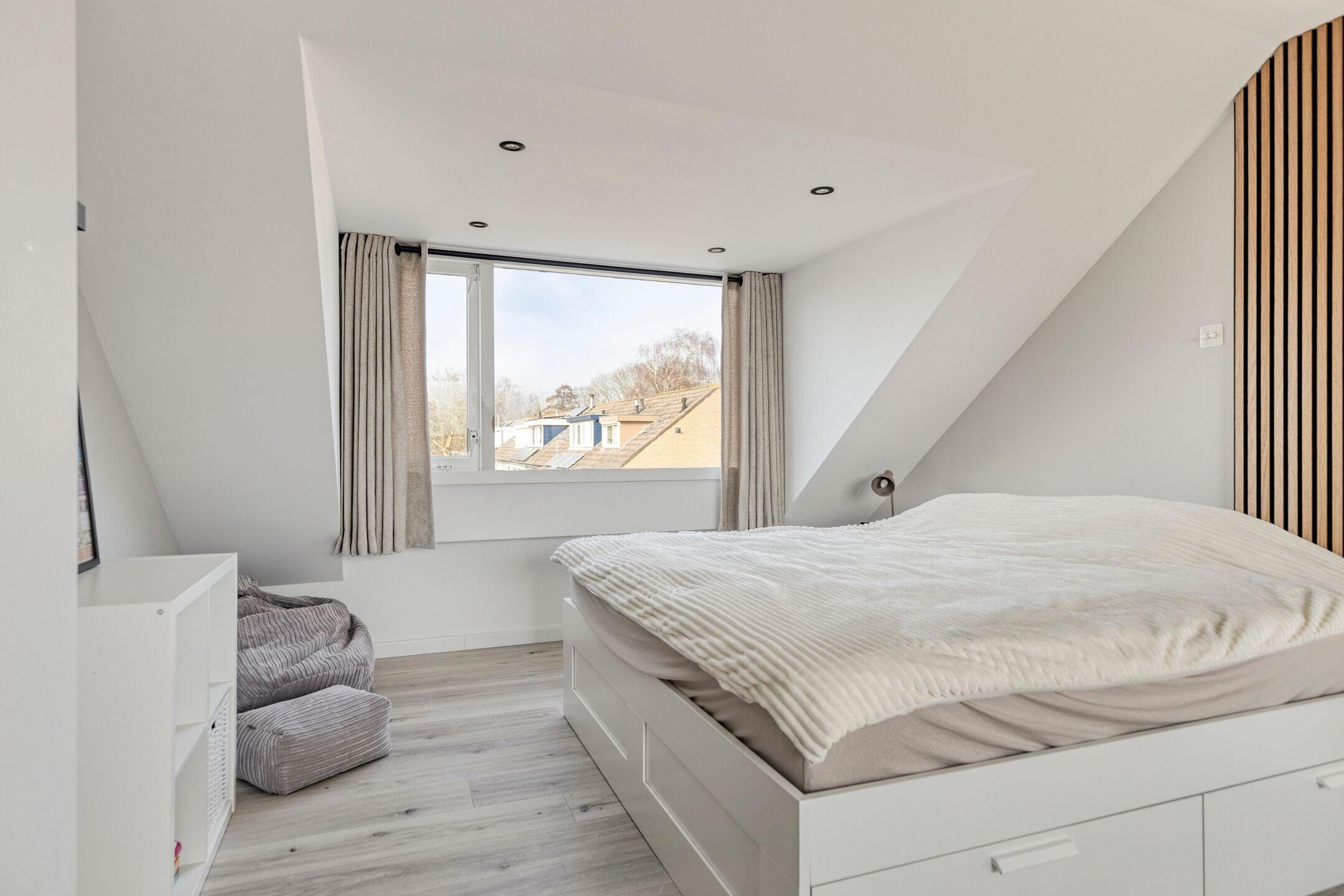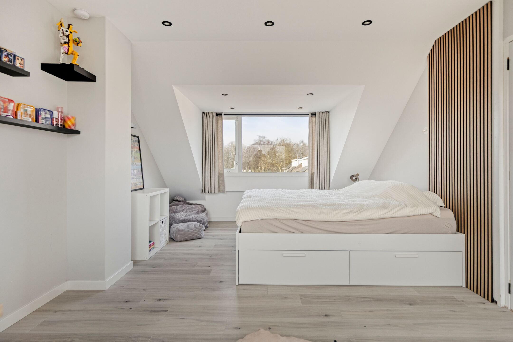 De zolderverdieping biedt verrassend veel ruimte en functionaliteit. Hier bevindt zich een royale zolderkamer die eenvoudig kan worden opgedeeld in twee volwaardige kamers, waarbij de verlichting al apart geschakeld is.
