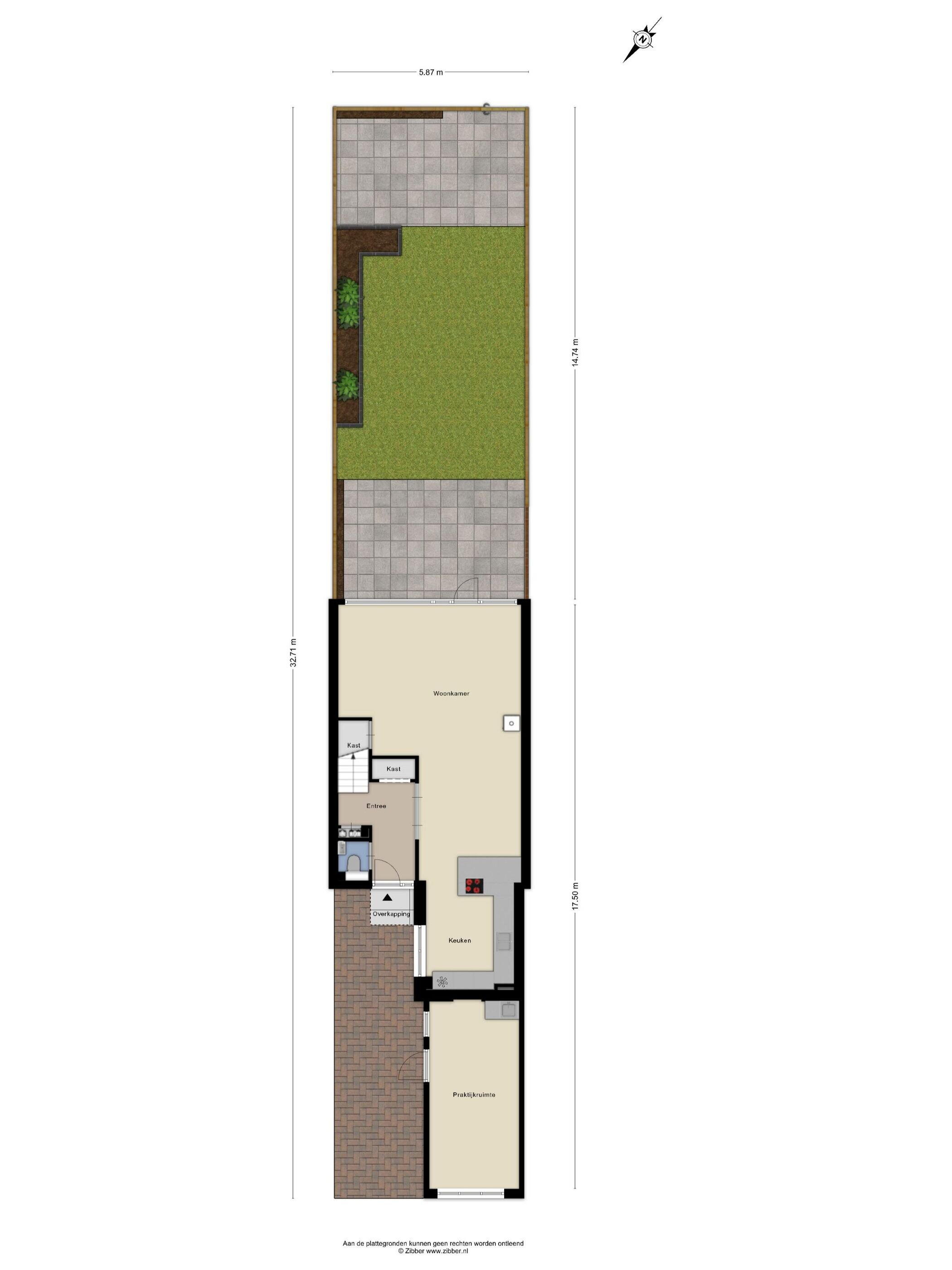 - 87 m² (14,74 meter diep en 5,87 meter breed)